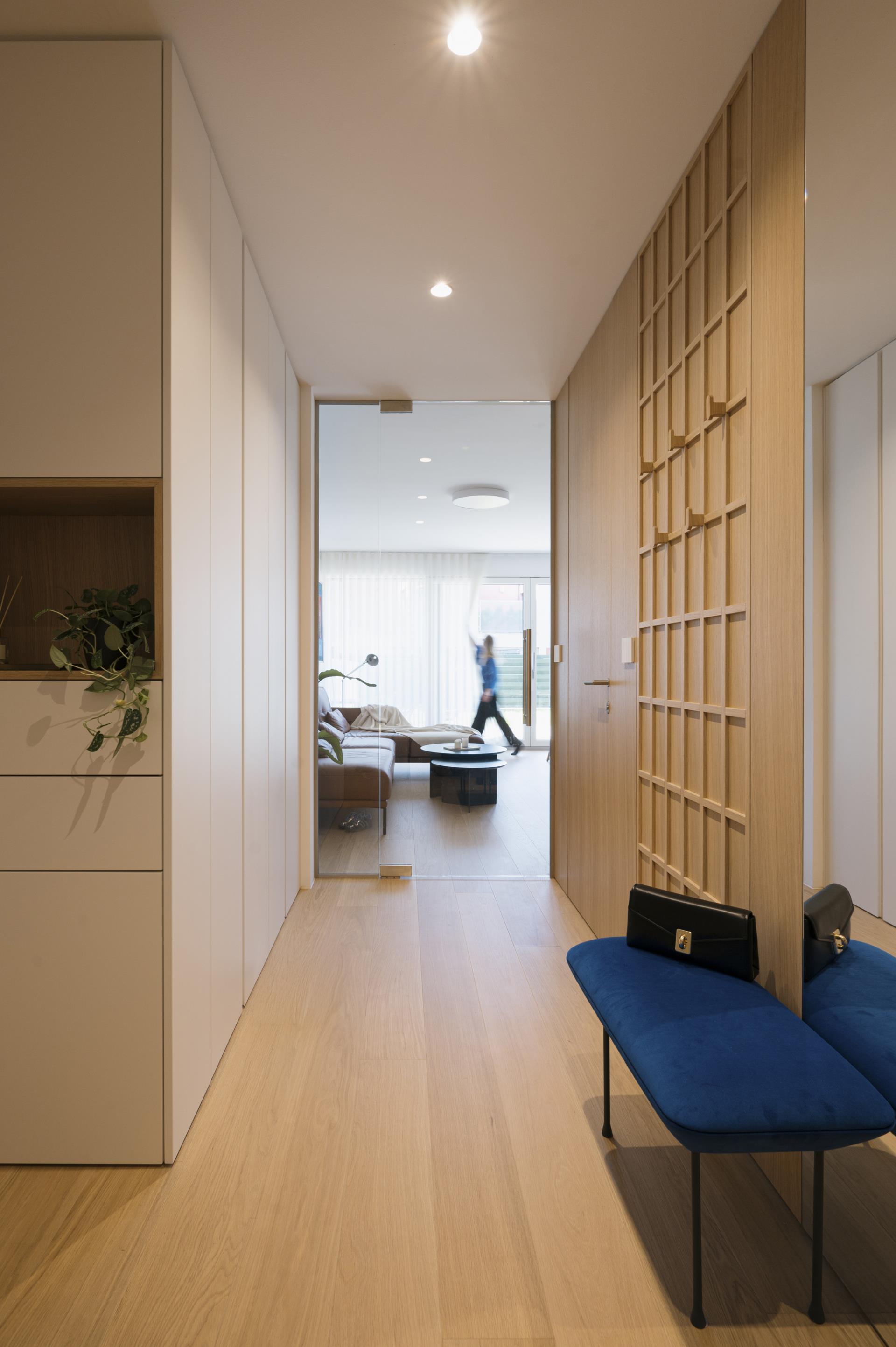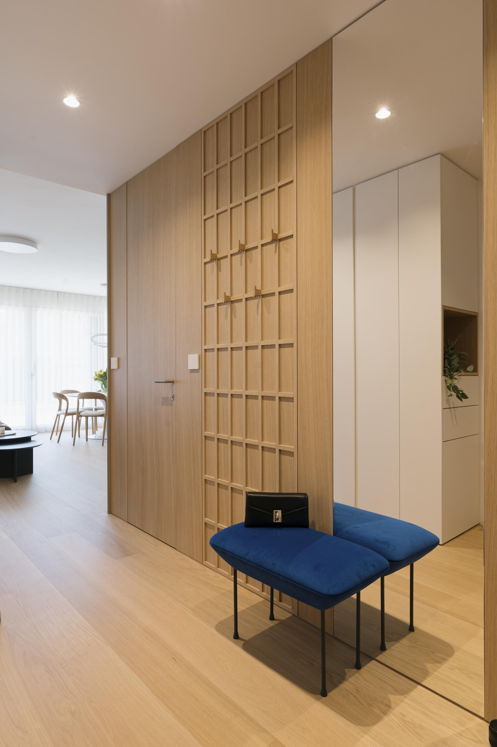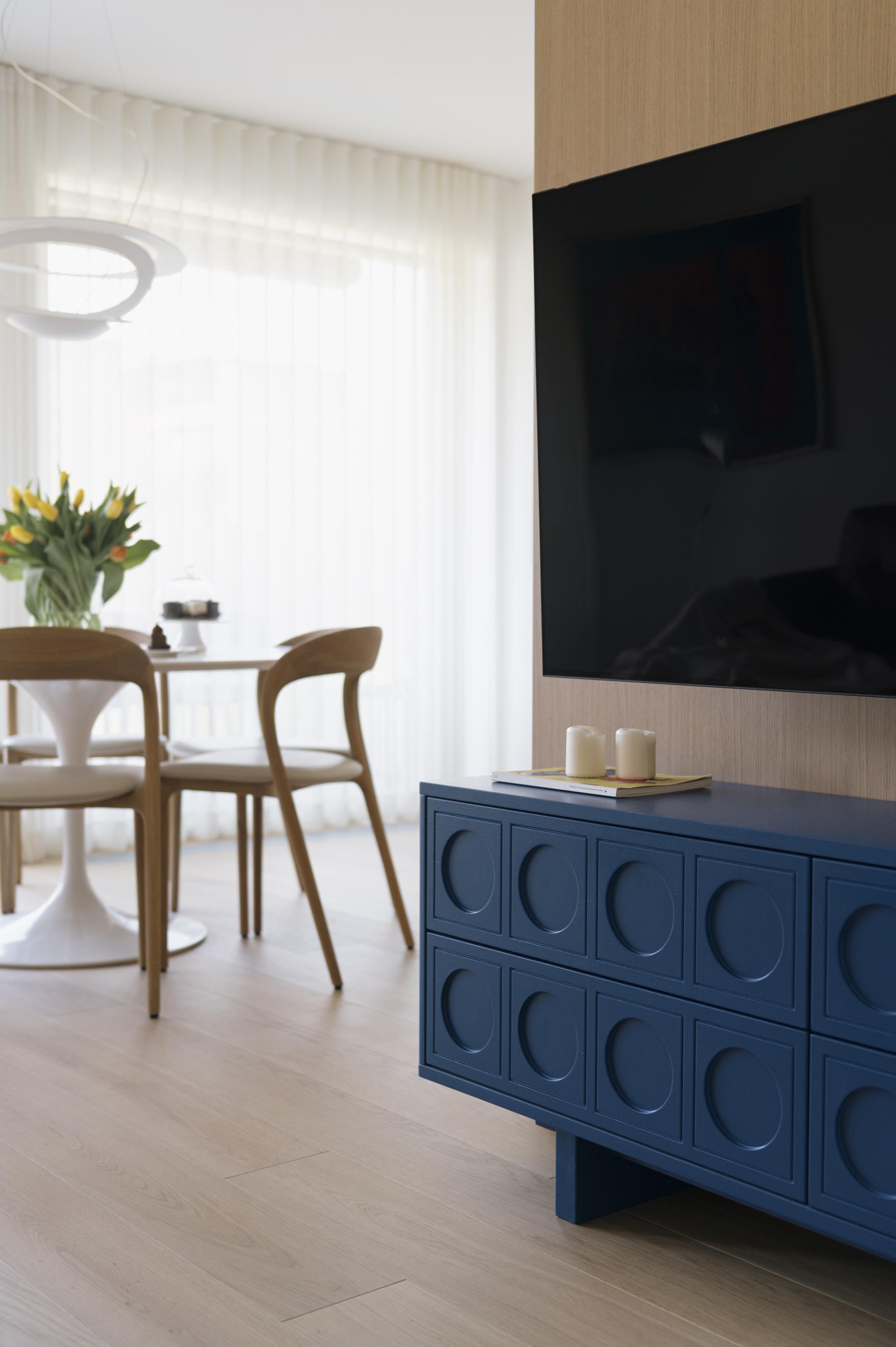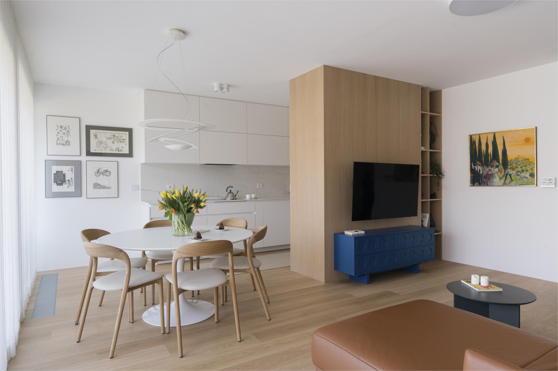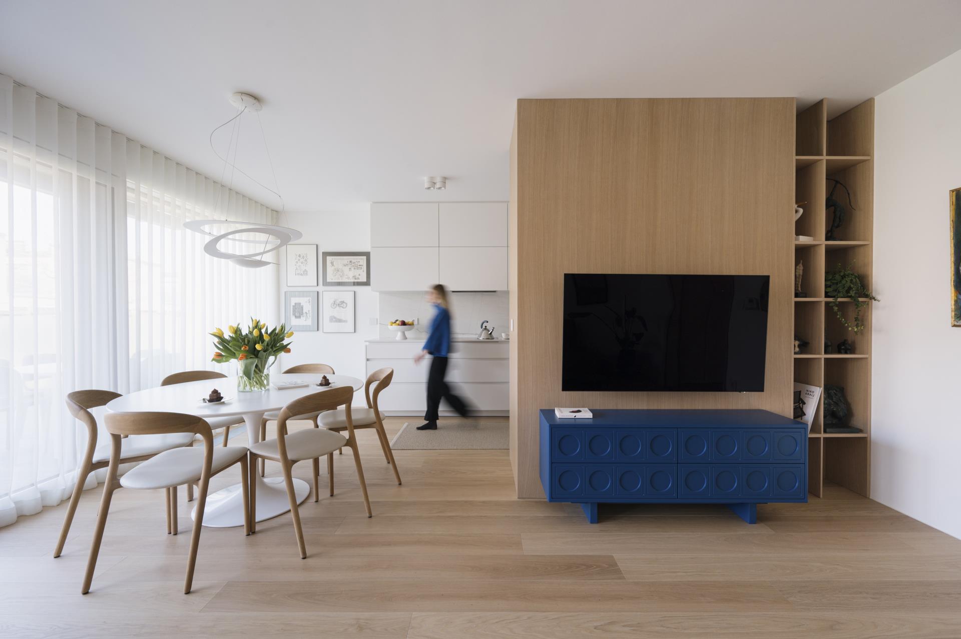 Umirjen, svetel interier, kjer kombinacija bele barve in toplega furnirja ustvarja brezčasen prostor. Izrazit moder poudarek prostoru doda karakter in subtilen kontrast. Interier: studio DizartFoto: Lenart Megušar