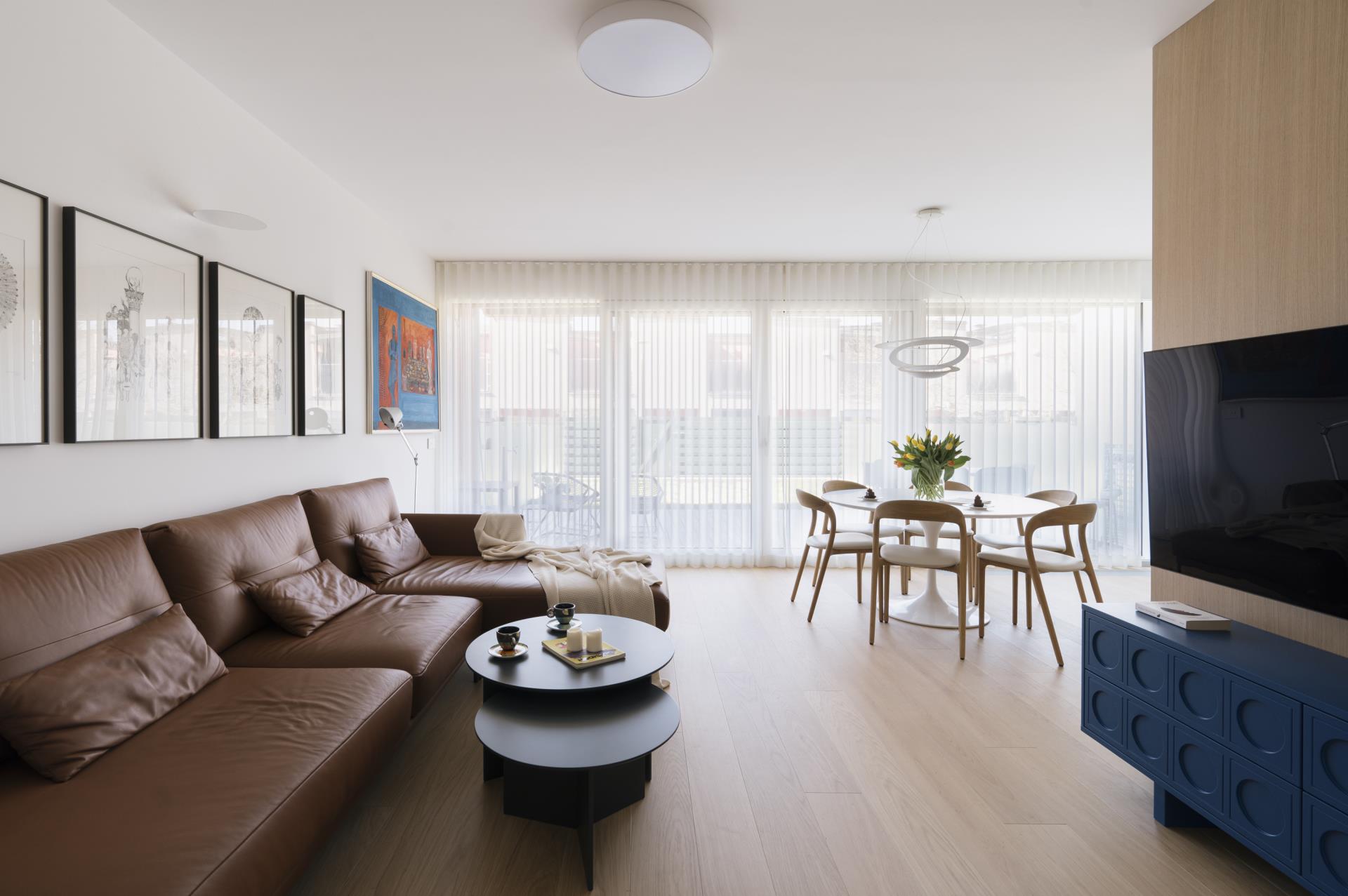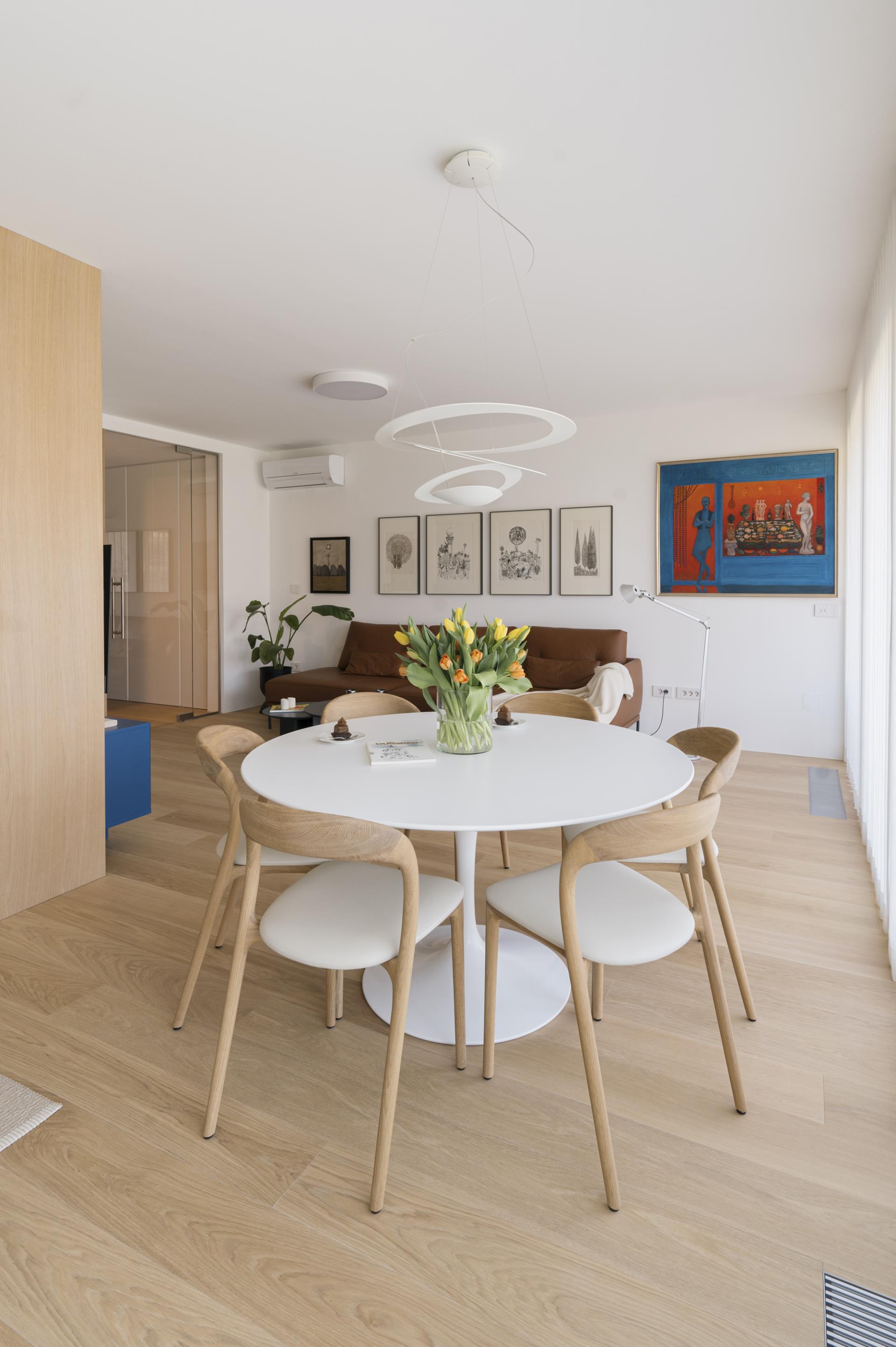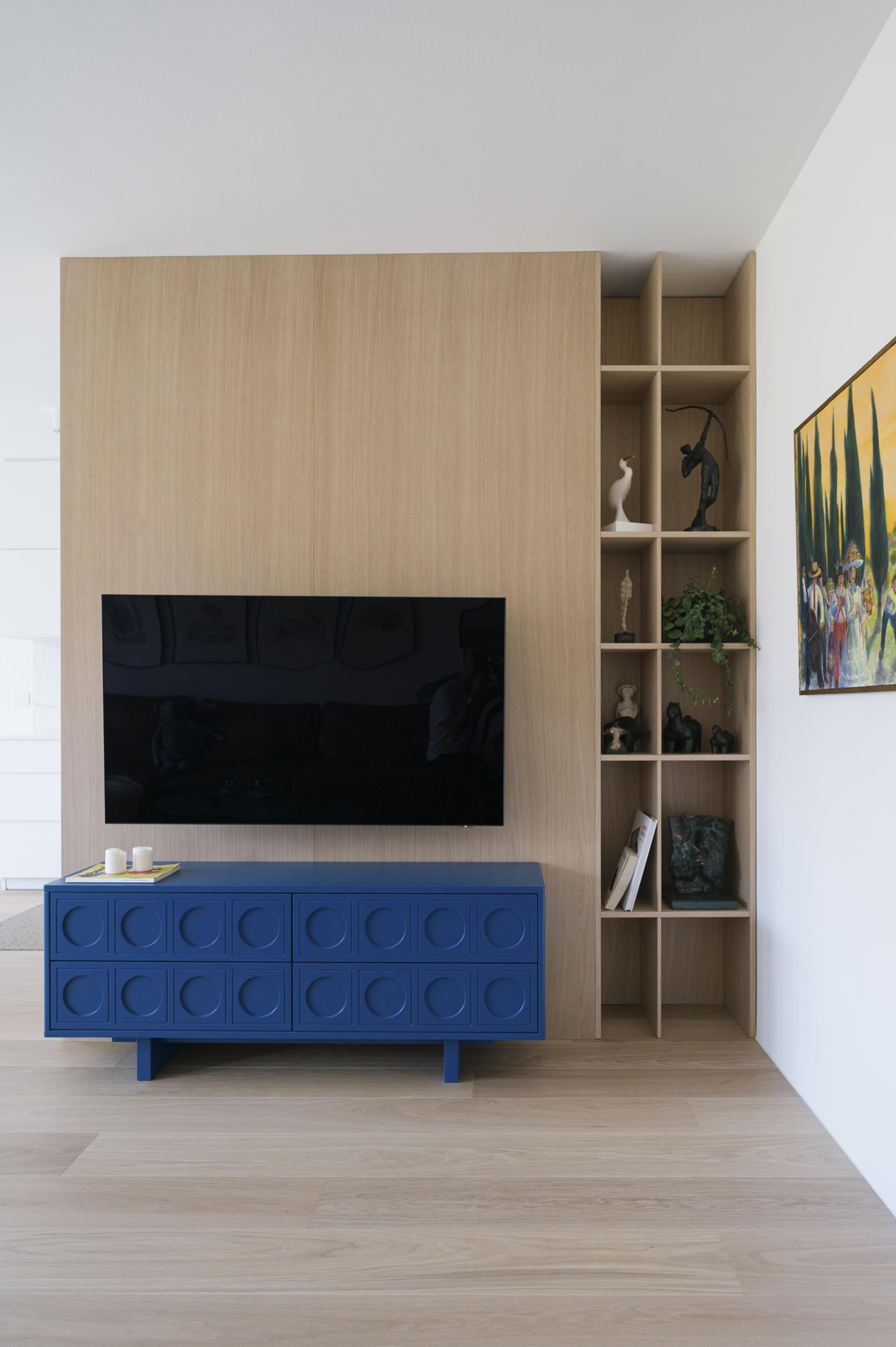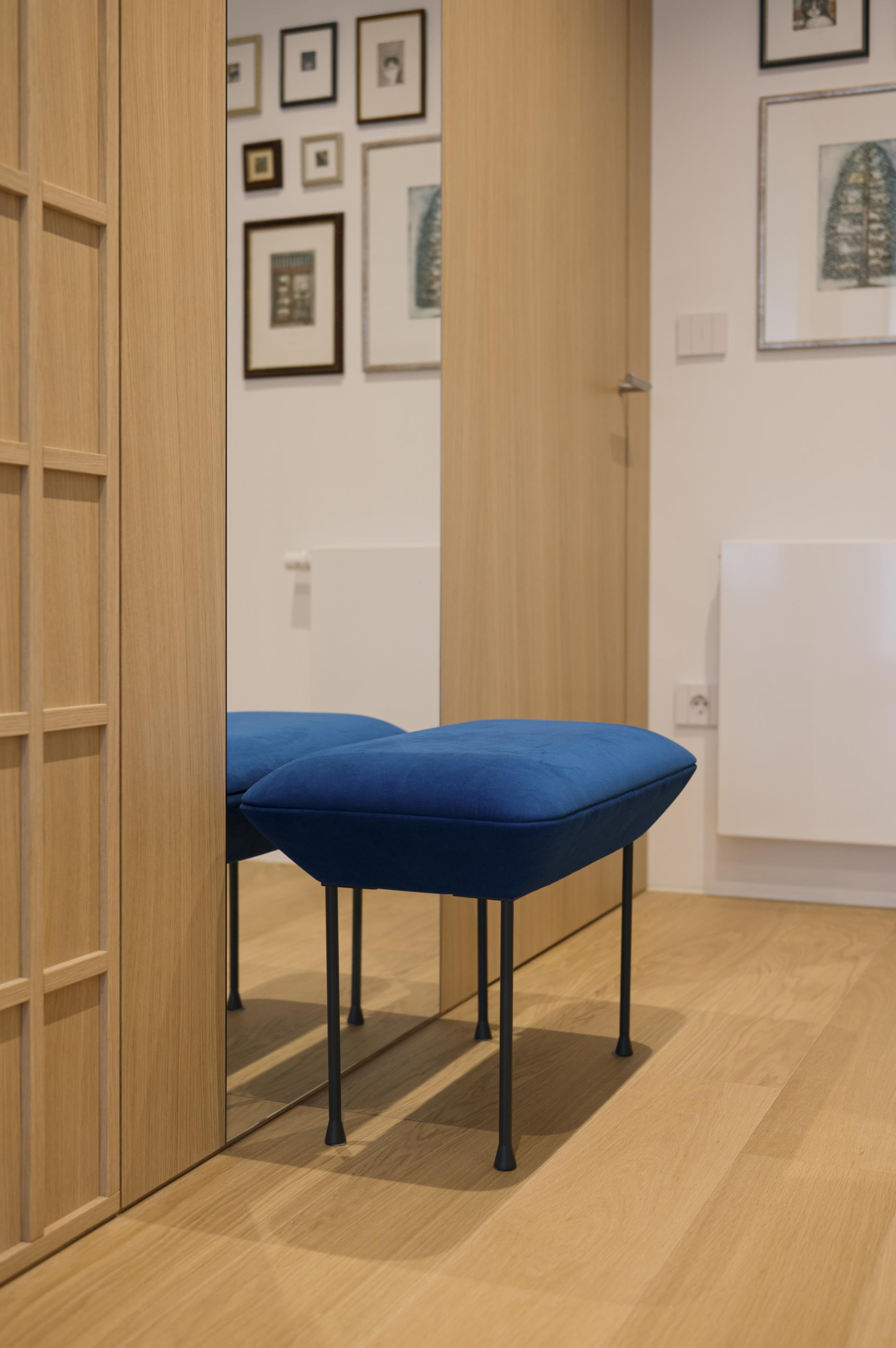 Umirjen, svetel interier, kjer kombinacija bele barve in toplega furnirja ustvarja brezčasen prostor. Izrazit moder poudarek prostoru doda karakter in subtilen kontrast. Interier: studio DizartFoto: Lenart Megušar