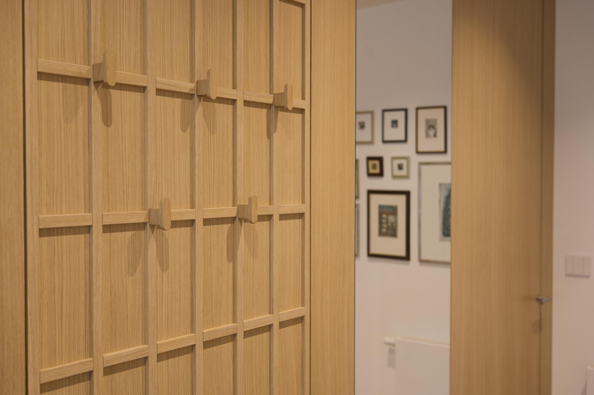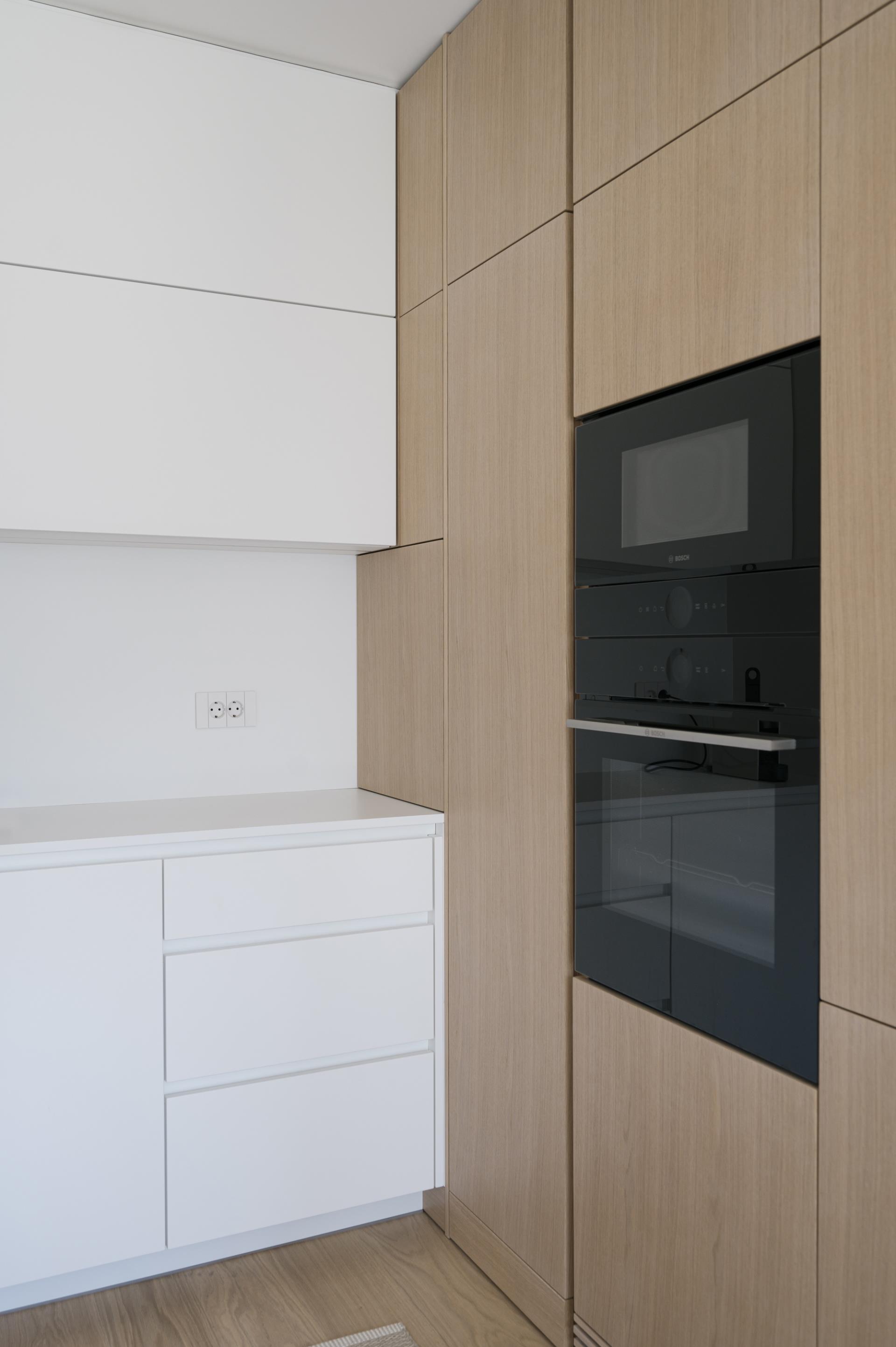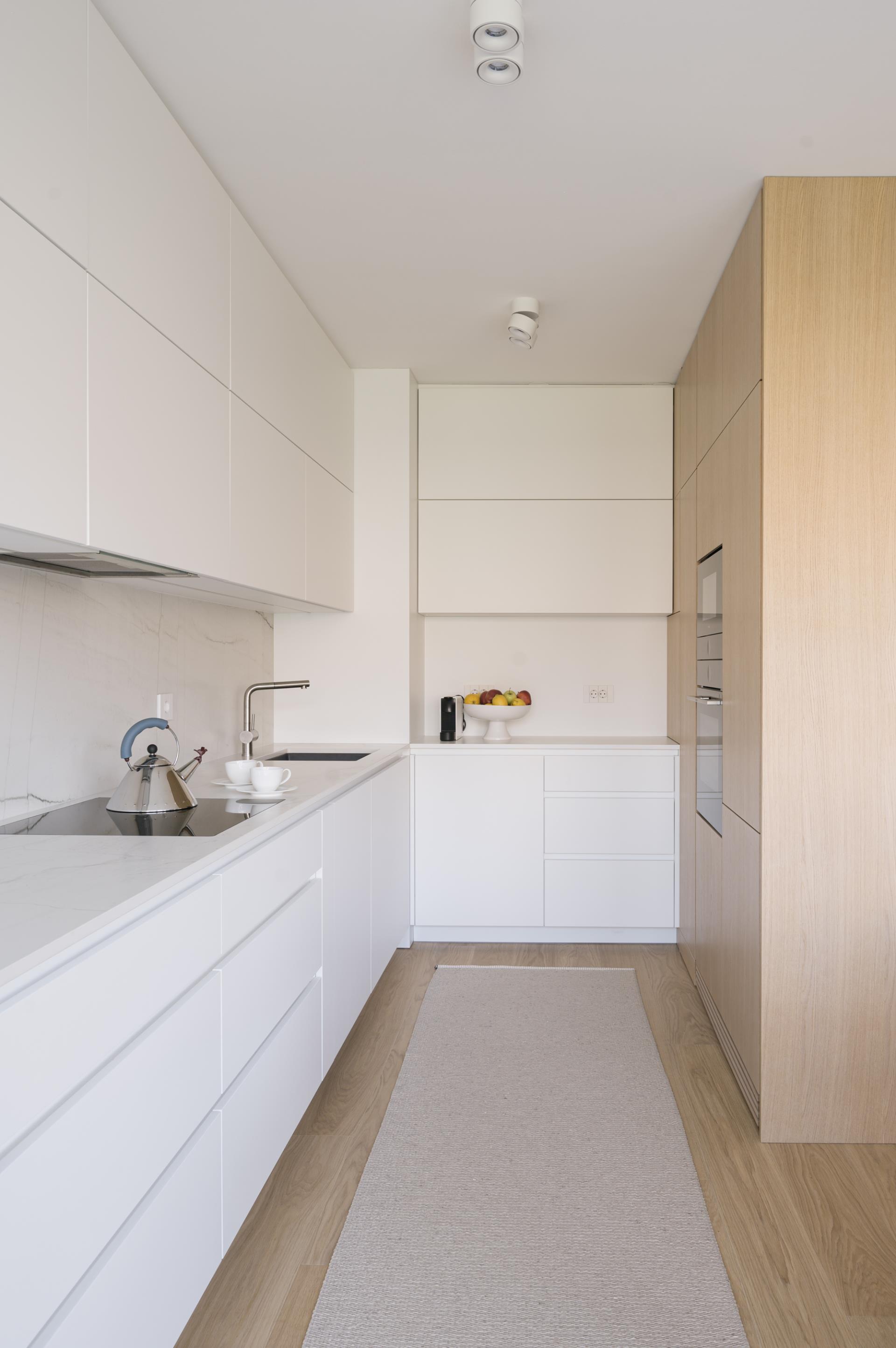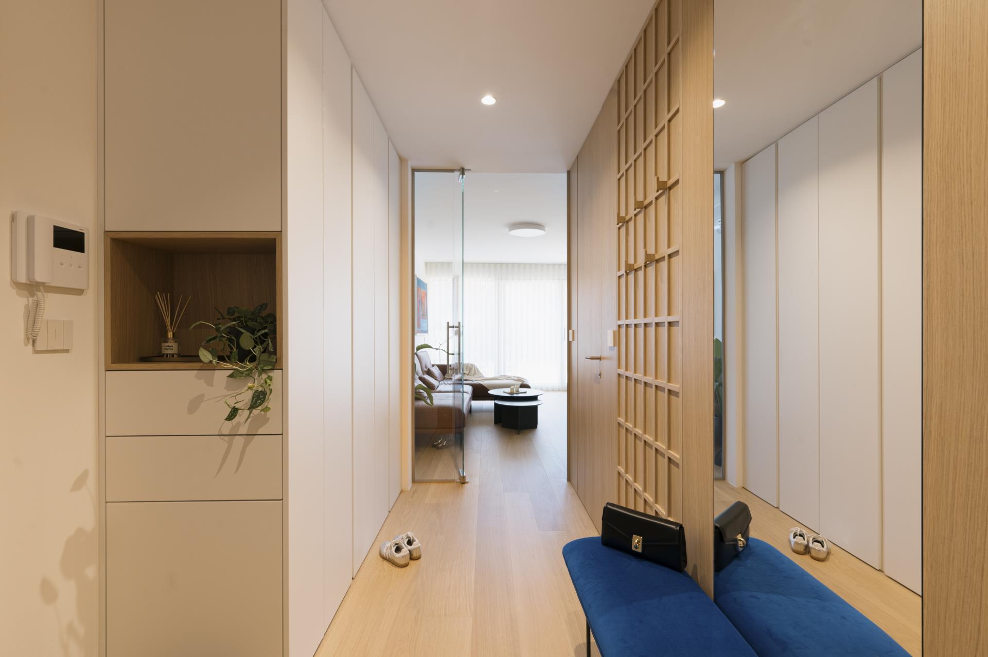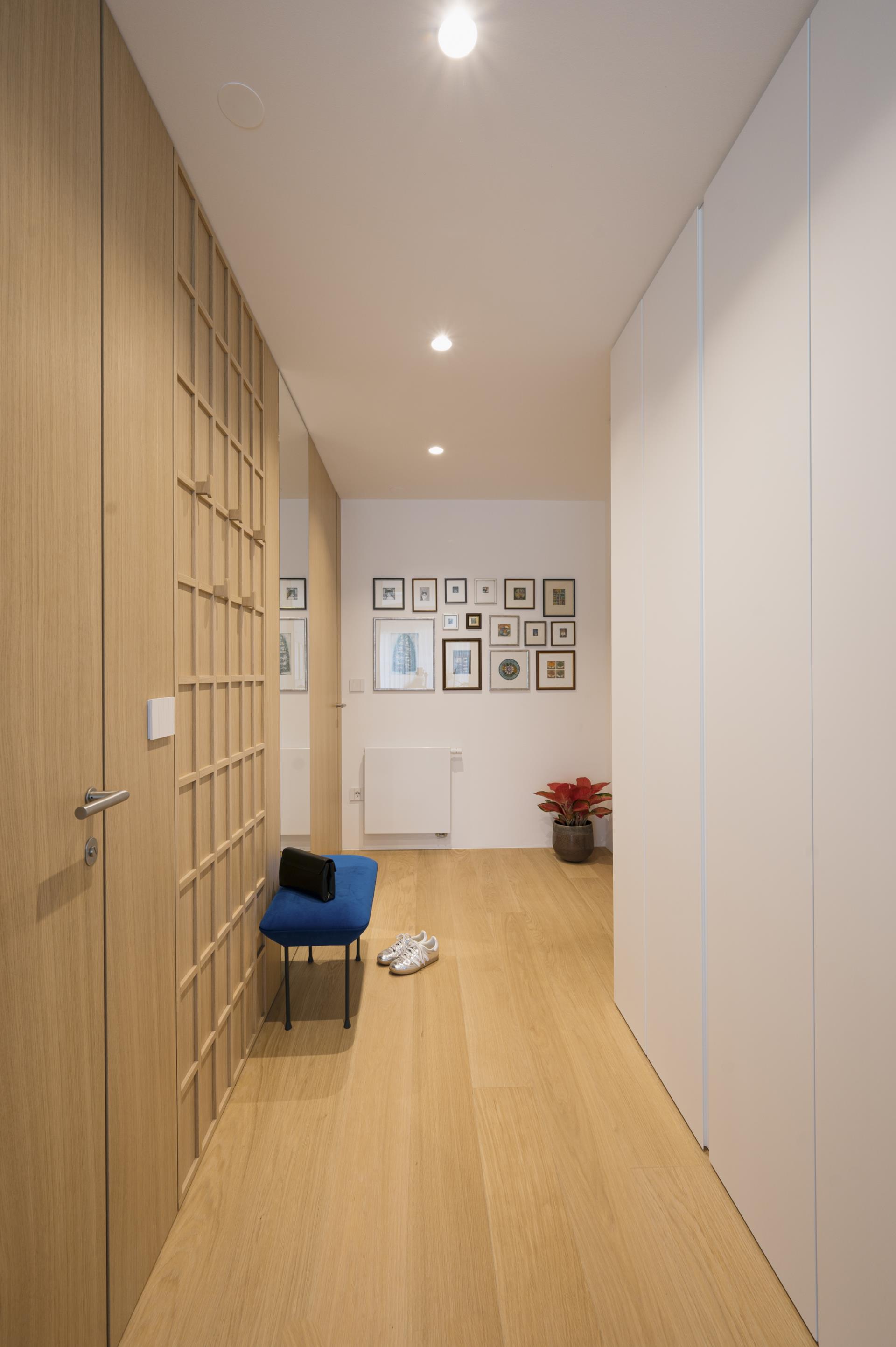 Umirjen, svetel interier, kjer kombinacija bele barve in toplega furnirja ustvarja brezčasen prostor. Izrazit moder poudarek prostoru doda karakter in subtilen kontrast. Interier: studio DizartFoto: Lenart Megušar