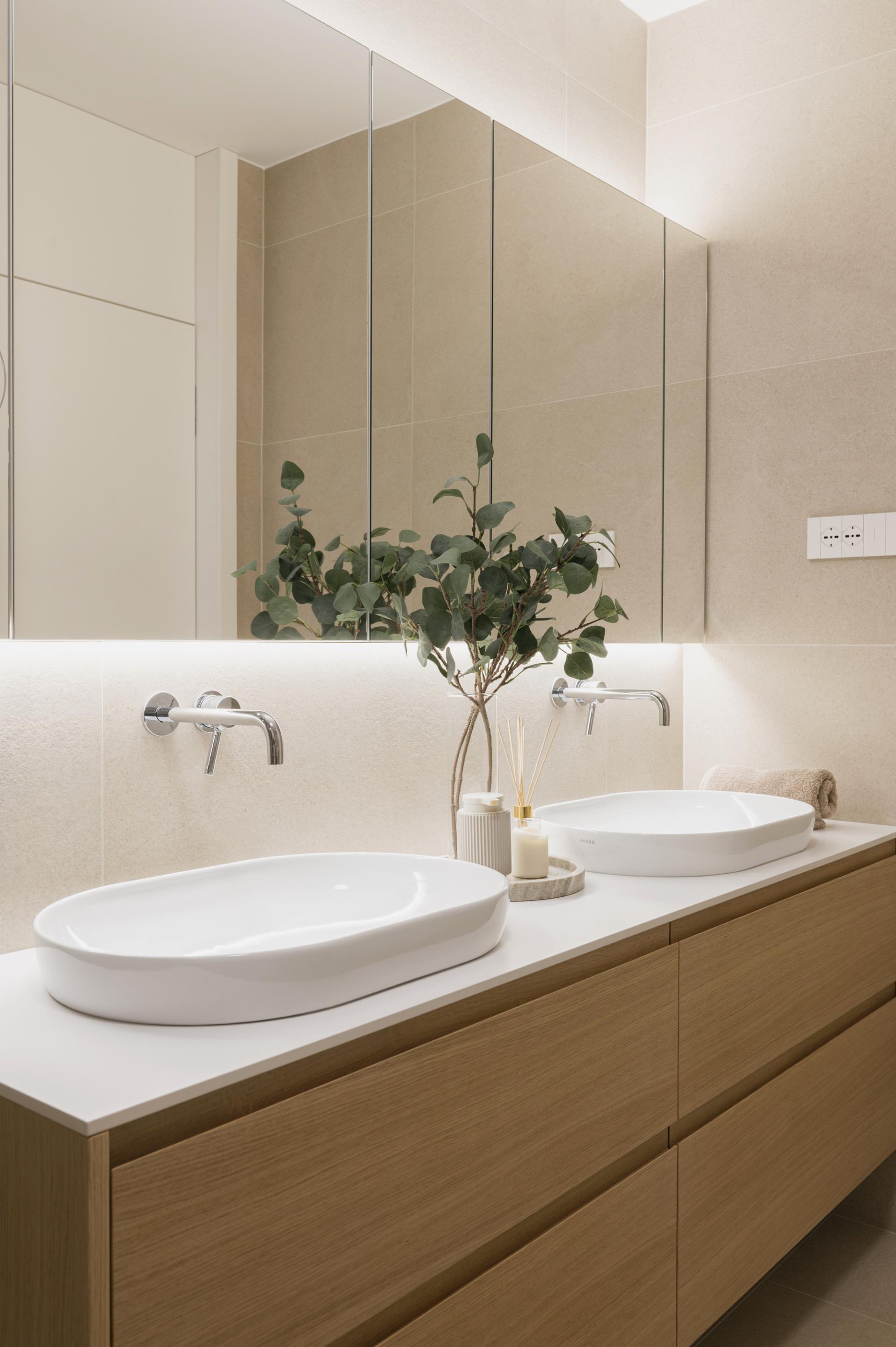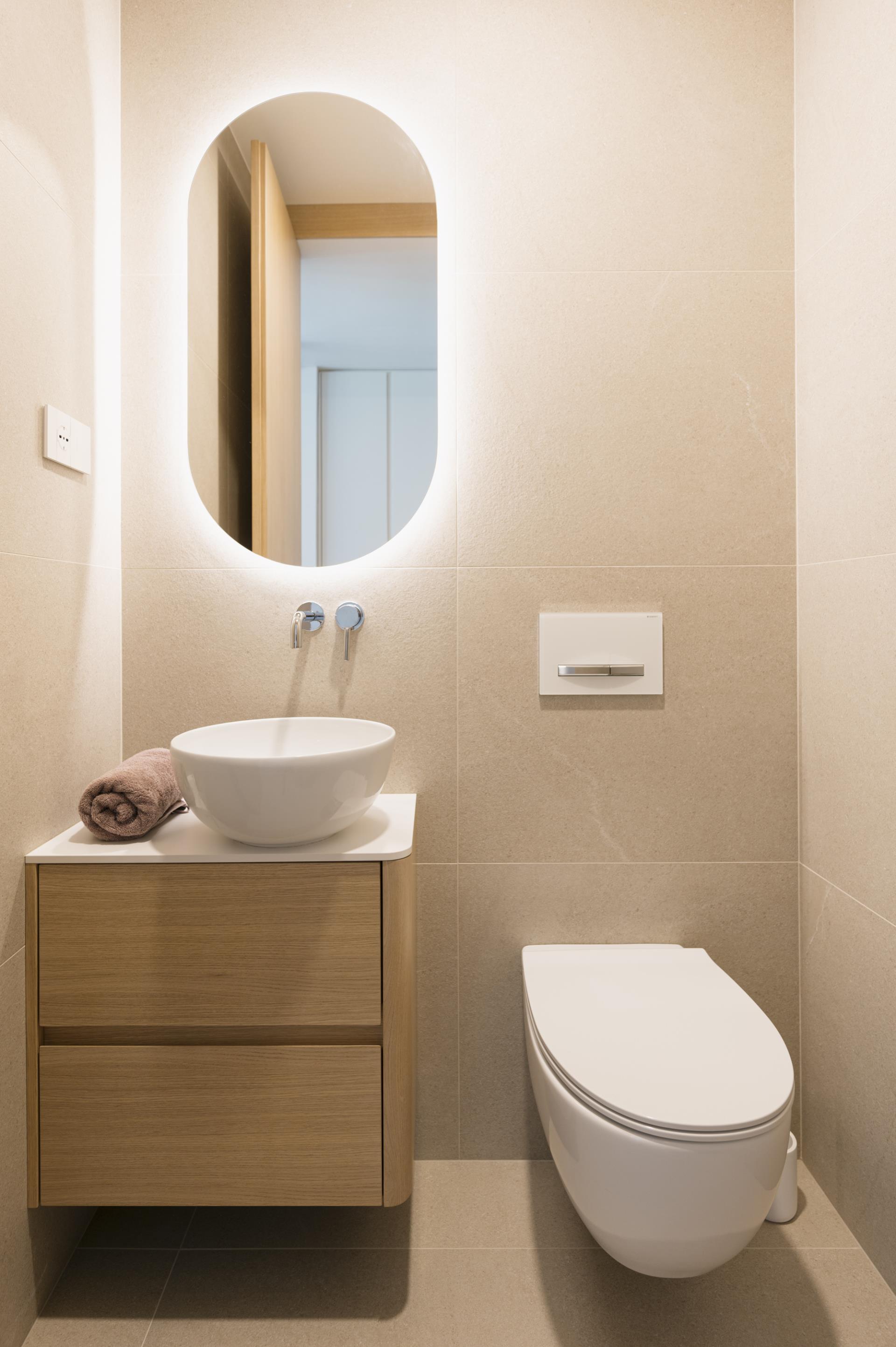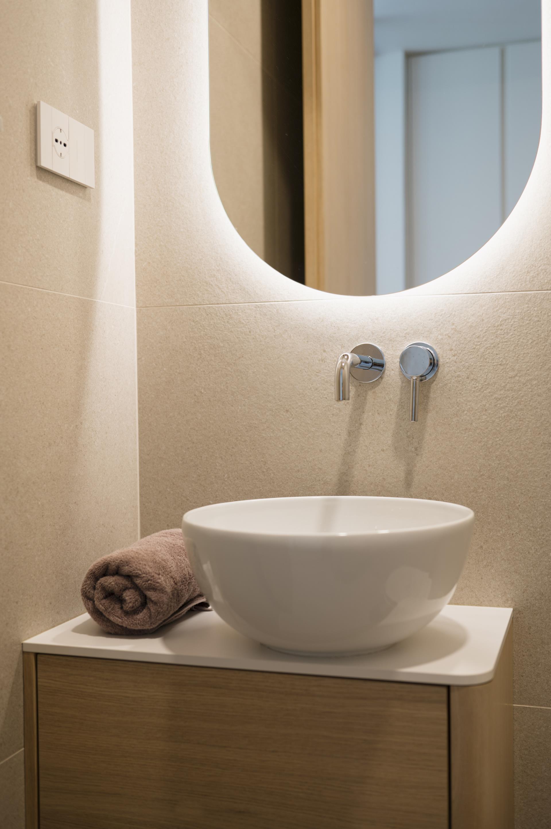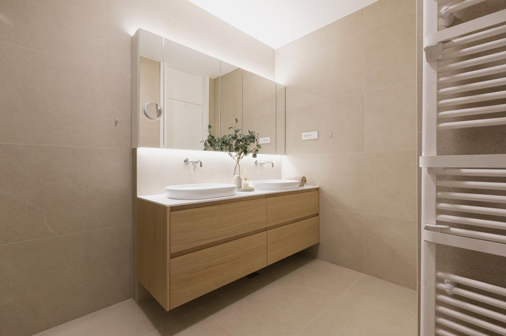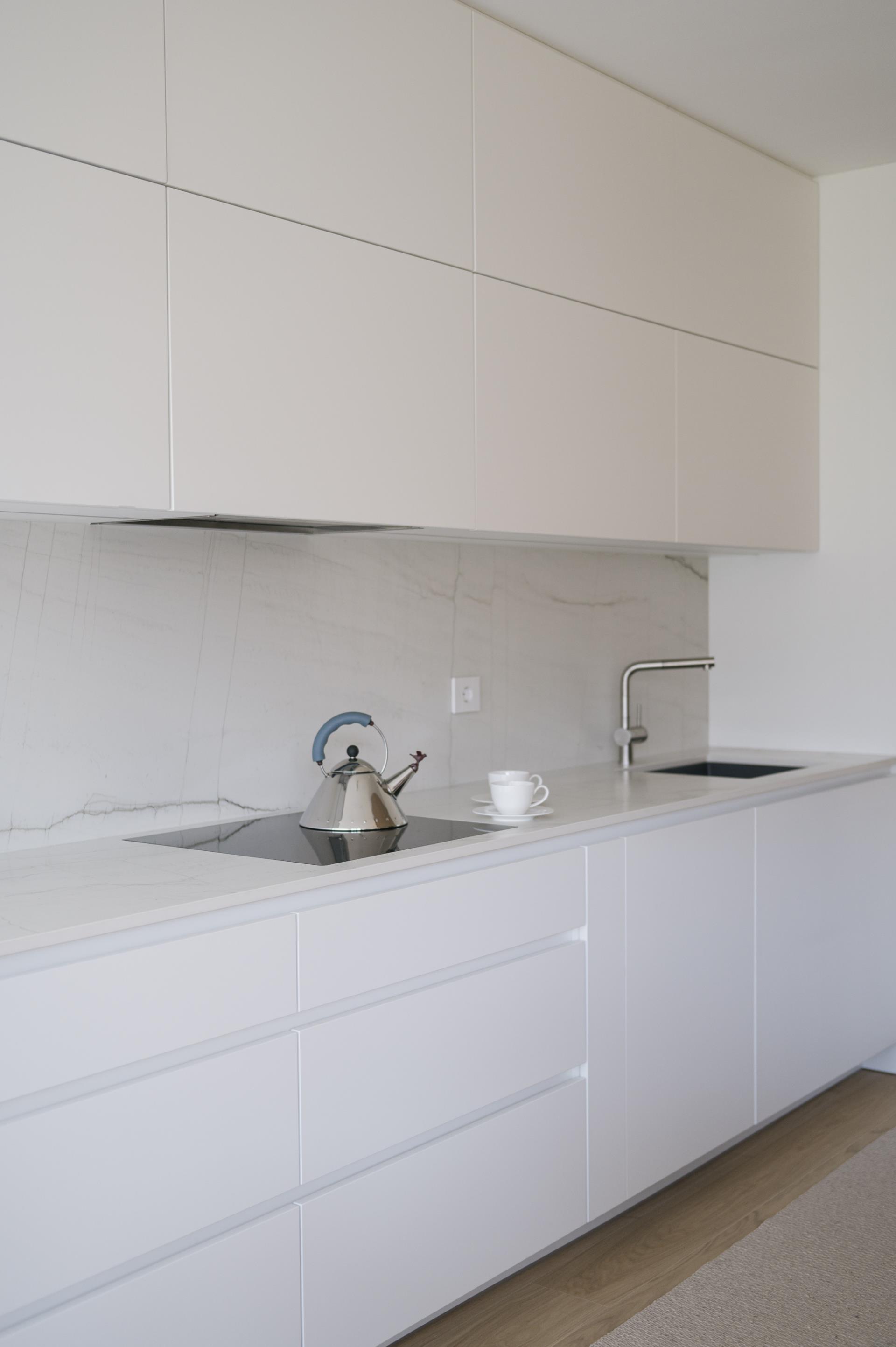 Umirjen, svetel interier, kjer kombinacija bele barve in toplega furnirja ustvarja brezčasen prostor. Izrazit moder poudarek prostoru doda karakter in subtilen kontrast. Interier: studio DizartFoto: Lenart Megušar